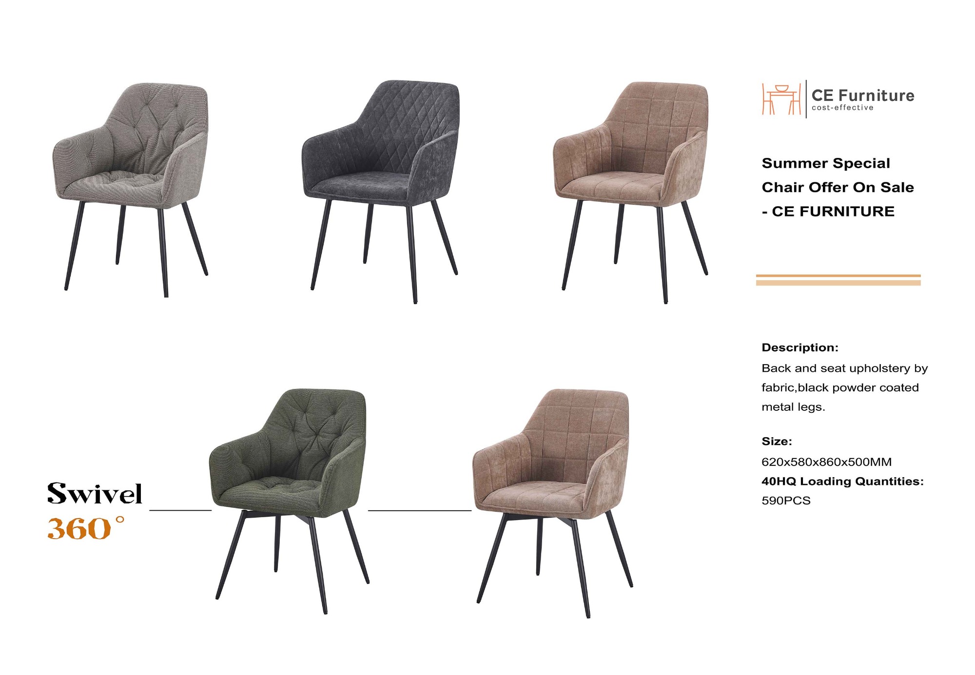The chairs below is our hot selling dining chairs. These have five types to choose: tufted upholstery with black metal legs, small diamond stitching upholstery with black metal legs, square tufted upholstery with black metal legs, tufted upholstery with balck swivel metal legs and squre stitching upholstery with black swivel metal legs. All of the chairs have a  modern and simple style, and all of them suit for dining room. Besides, these chairs will on sale in the summer of 2025, if you are looking for dining chairs or armchairs pls do not miss these chairs. And welcome to leave a message if you have any interest.
