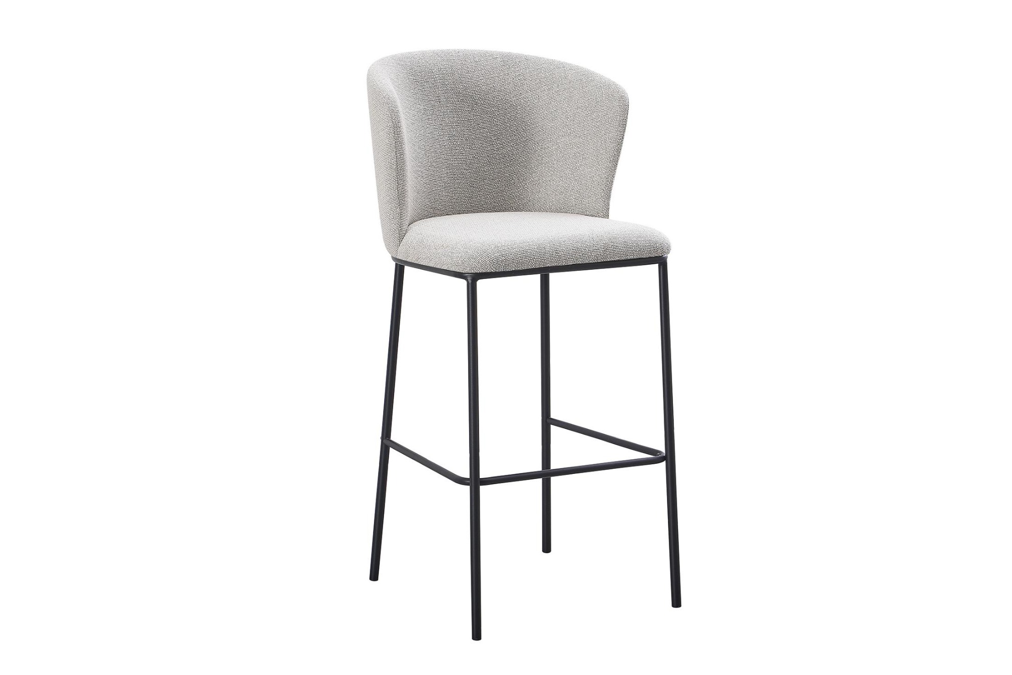 The bar chair covered in luxurious boucle fabric. This elegant chair boasts a shell shape back for added comfort and style, along with sleek black powder coated metal legs for durability. Perfect for adding a touch of sophistication to any space, whether it be a kitchen island, a bar area, or a trendy cafe. The boucle fabric not only adds texture and visual interest but also provides a cozy seating experience.